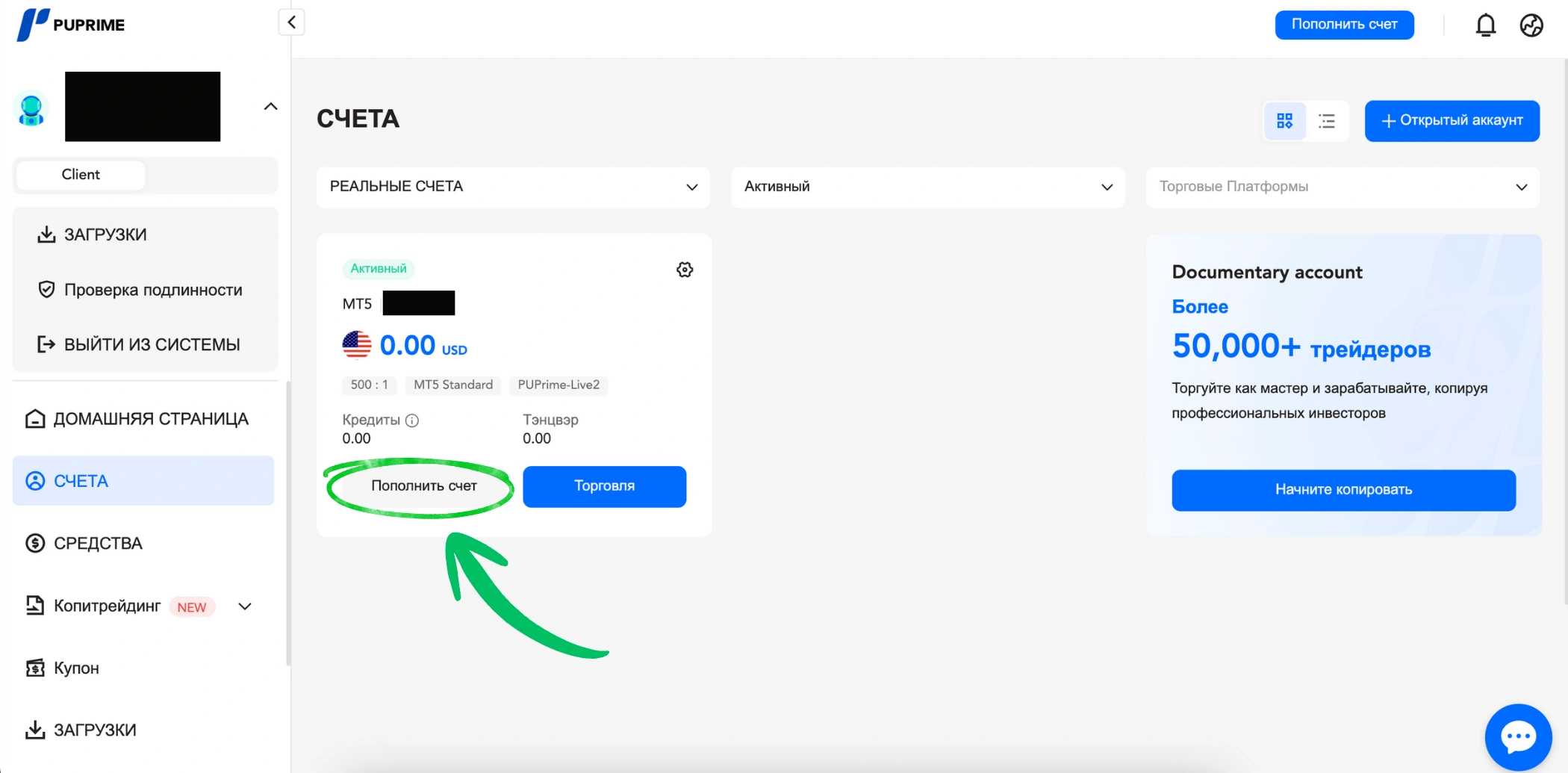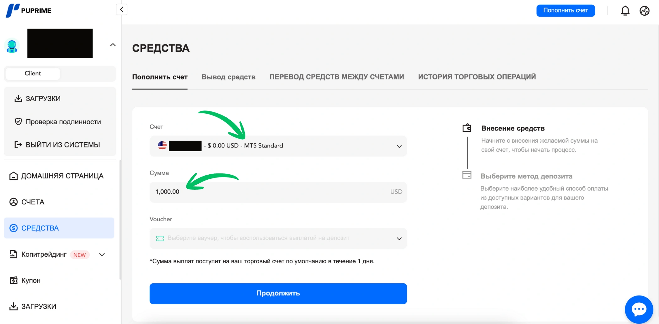 3. Внесите деньги на счет.
